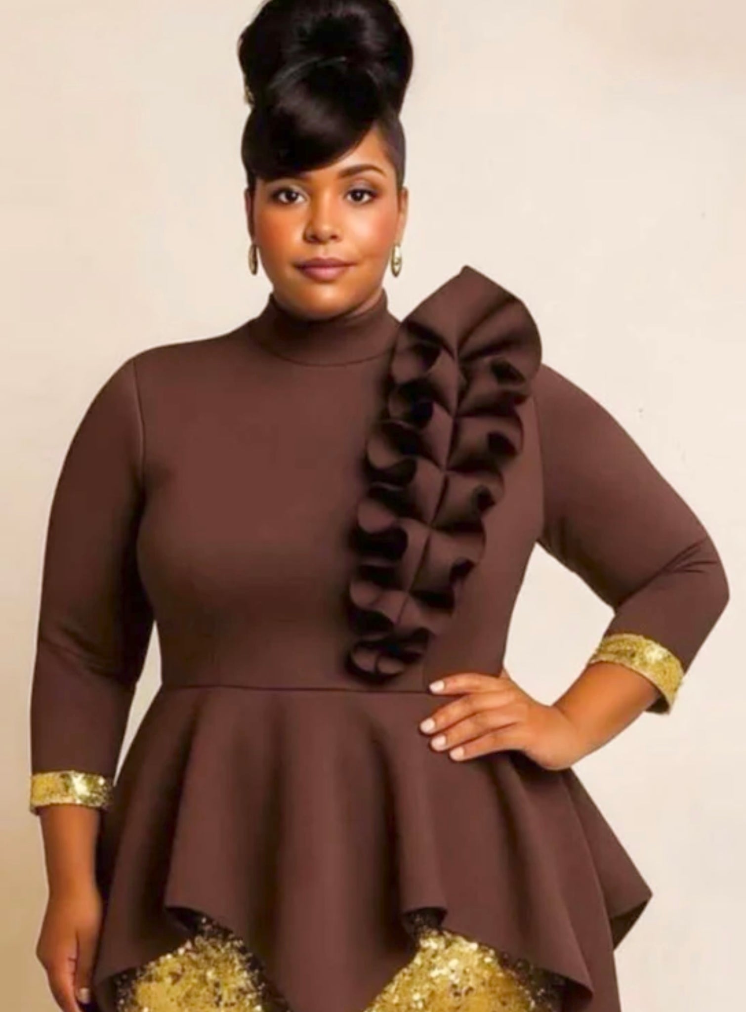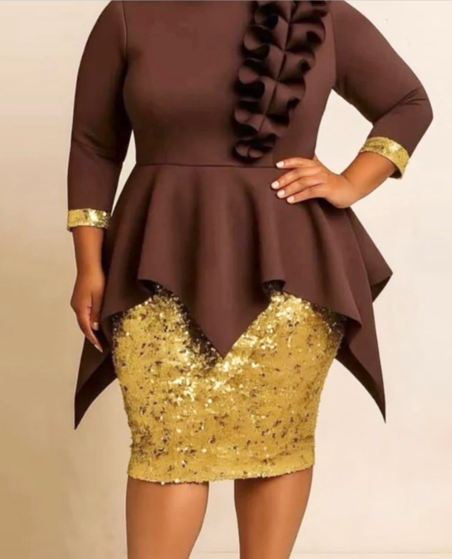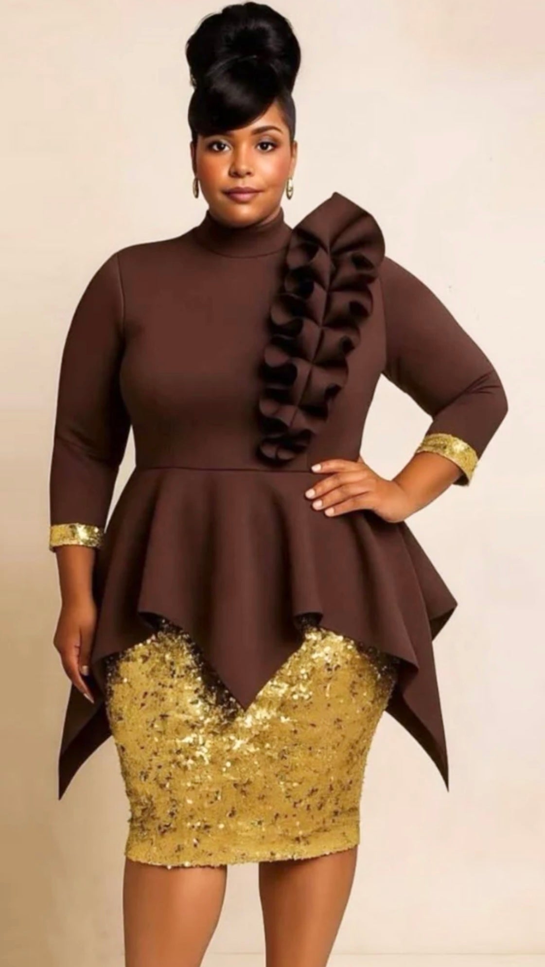 This beautiful thing is definitely a statement piece!Brown Scuba top with dramatic ruffle & Paired with gold sequin pencil skirt.